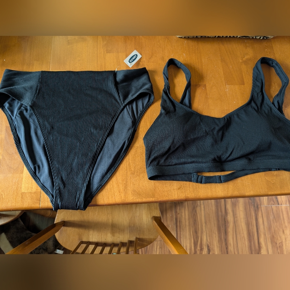 Old navy black ribbed bikini set. Includes a top and high-waisted bottom. The top has an adjustable back Top and bottom are both XXL and nwt