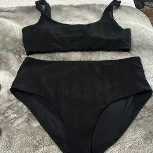 Stylish black ribbed bikini set. Includes a top and high-waisted bottom. Full coverage bottom
