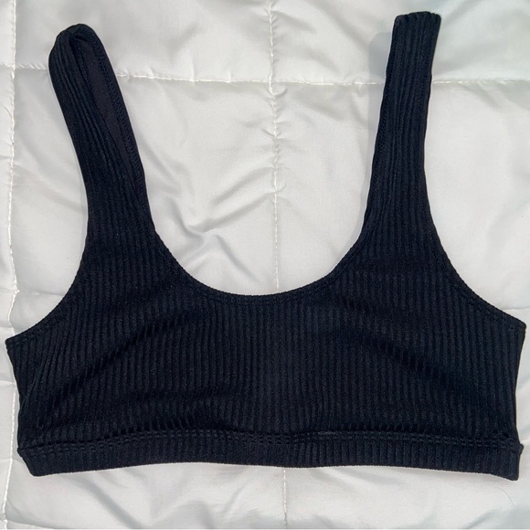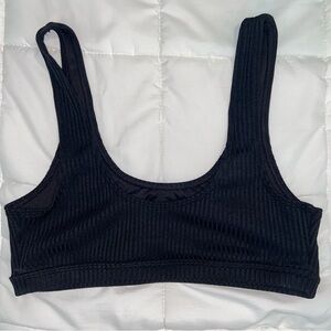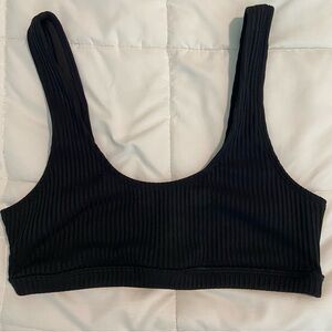 Black ribbed bikini top size medium. Would fit those with C cups and below best. It has a ribbed texture to it and is basically brand new - hardly ever worn! There is no padding.