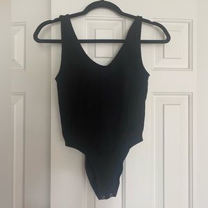 Ribbed black scoop neck and lower coop back bodysuit. Snap bottom closure.