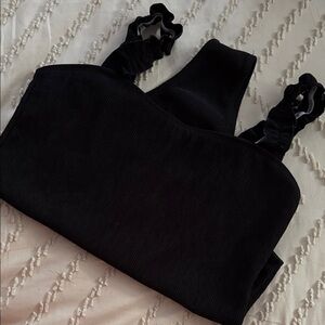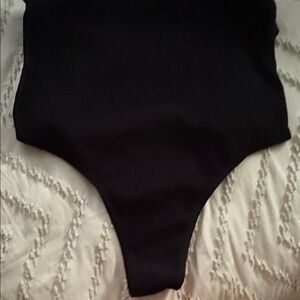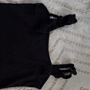 Stylish black ribbed bodysuit featuring ruffle straps. Perfect for any occasion.