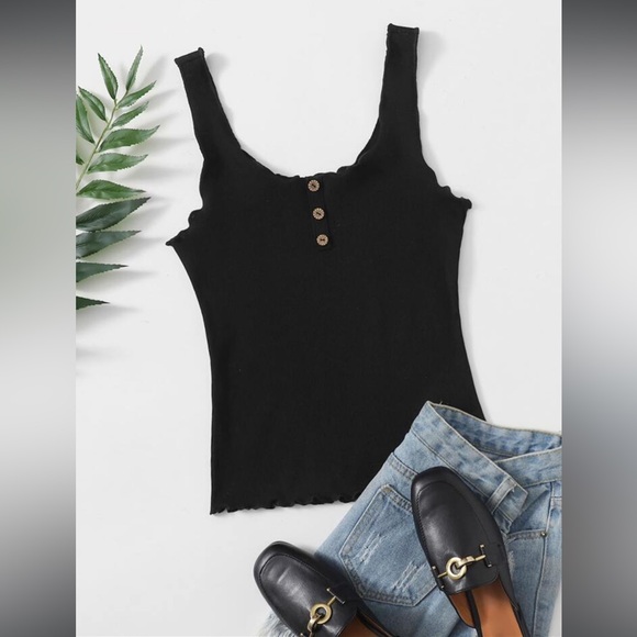 Black Ribbed Button Front Tank Top Fitted Stretch Basic Size Small