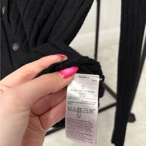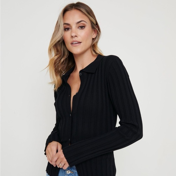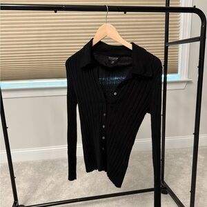 First photo added for styling inspo, not exact shirt. Elegant black button up top made from 100% merino wool. Ideal for versatile styling.