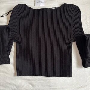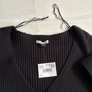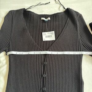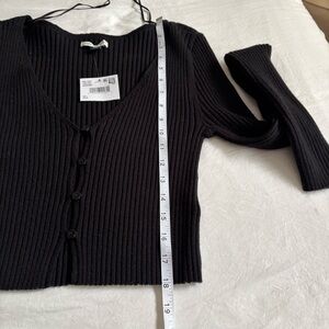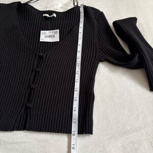 Stylish black ribbed cardigan with button-up front. Perfect for layering.