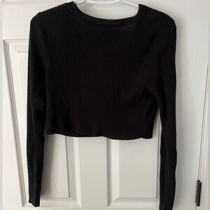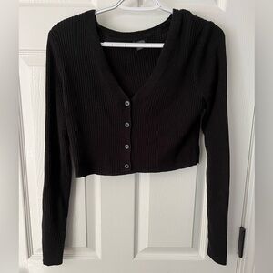 Stylish black ribbed cardigan with button-up front. Perfect for layering.