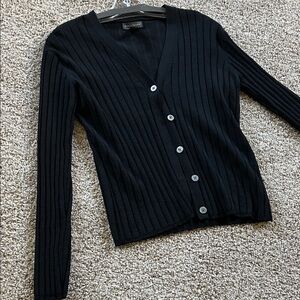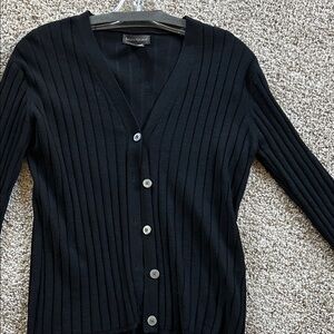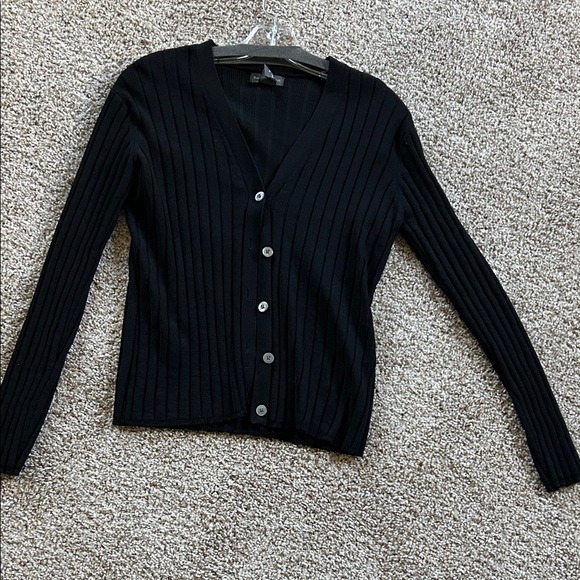 Elegant black cardigan with ribbed texture. Features button-up front. Ideal for versatile styling.