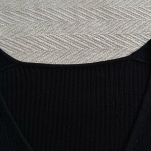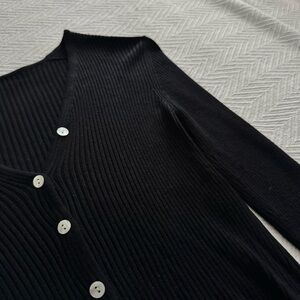 Stylish black ribbed cardigan with button-up front. Perfect for layering.
