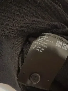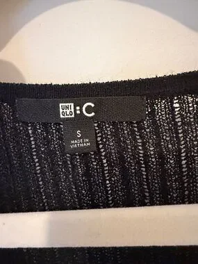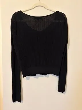 Slim-fit ribbed cardigan with button front. Long sleeves and flattering scoop neckline. Lightweight knit, versatile layering piece. Classic black color.