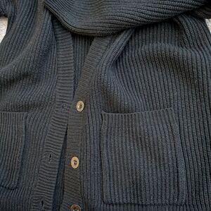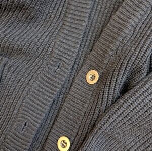 Stylish black ribbed cardigan sweater. Features a button-up front, with bronze style buttons.