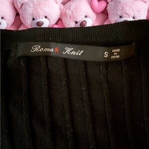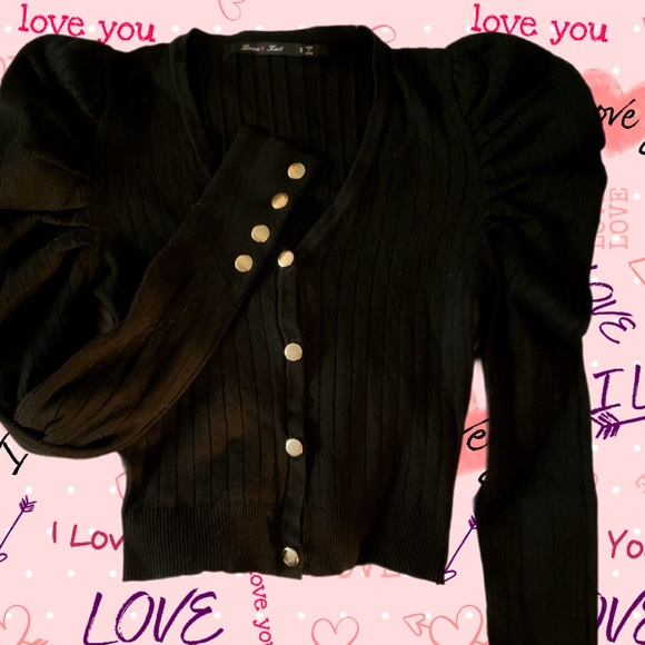 Stylish black ribbed lightweight cardigan featuring elegant gold buttons and moderately puffed shoulders. Perfect for any occasion, super comfy and easy to style up or down. 55% cotton, 45% polyester. Works well worn solo or over another shirt. Front buttons are functional, sleeves are just for design. Never worn but no tags.