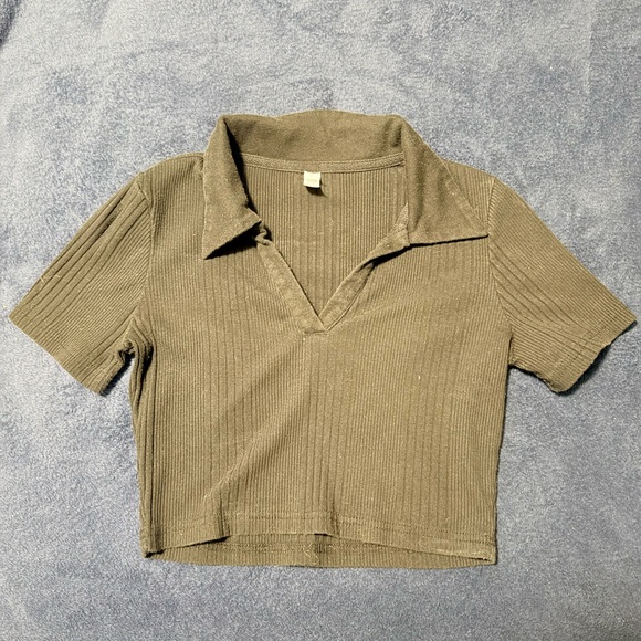 Stylish black ribbed crop top with a collared neckline. Perfect for casual wear