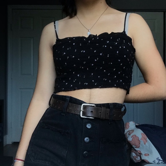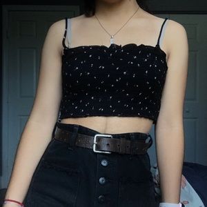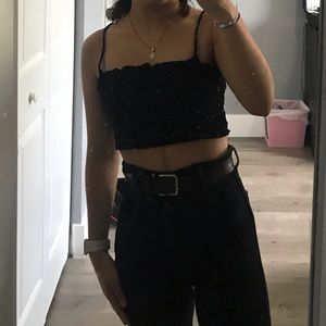 Black Crop Top with small flower designs throughout, the fabric is ribbed and the straps are very skinny ! The straps are a kinda long but that can be easily fixed, very cute with high waisted pants or a skirt !! Size small but fabric is very stretchy.