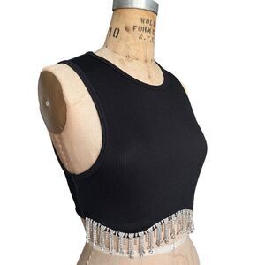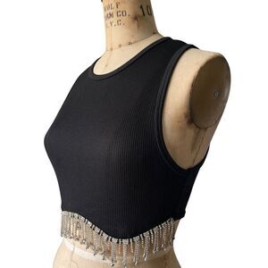 Black Ribbed Crop Top with Rhinestone Fringe Size S