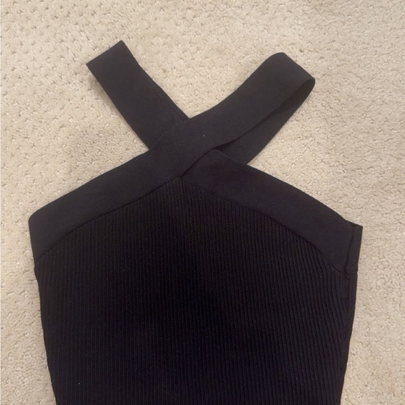 Figure-hugging ribbed knit tank with cross-back straps. Clean, minimalist silhouette. Easy to style from day to night.