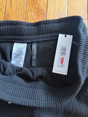 Comfortable black ribbed pants with an adjustable drawstring waist. Soft, breathable fabric designed for everyday wear. Straight leg fit for a relaxed, modern look. Easy-care material for low-maintenance styling.
