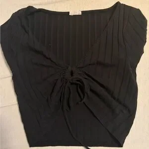 Stylish black ribbed crop top with a flattering V-neck and front drawstring detail. Soft stretch fabric offers a comfortable, form-fitting silhouette. Versatile for layering or wearing solo for a sleek look.