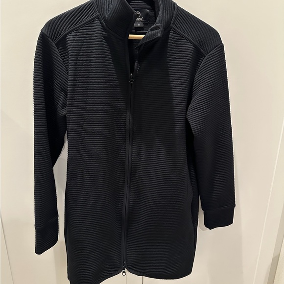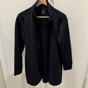 Stylish black ribbed jacket with a zip-up front. Perfect for layering.