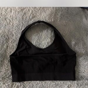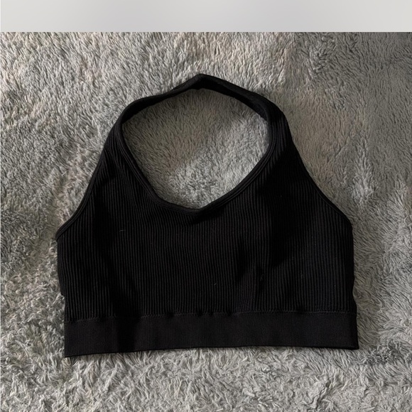 Stylish black ribbed halter top. Perfect for casual wear.