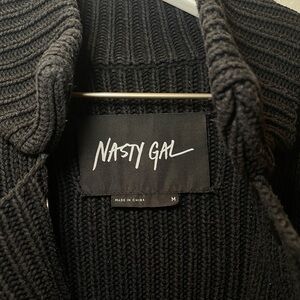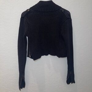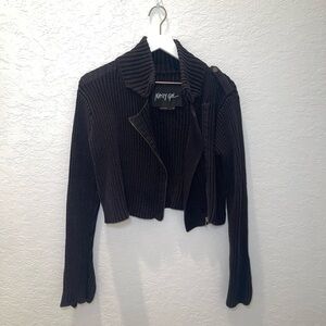 Stylish black ribbed knit jacket with a unique zipper design. Perfect for layering.