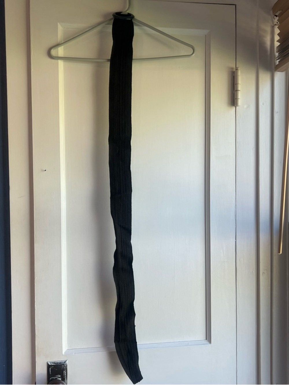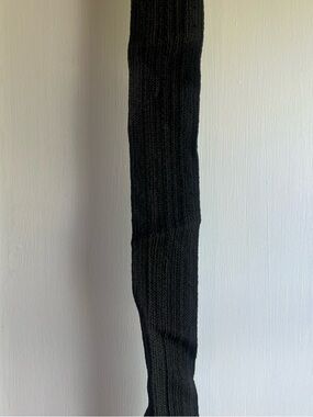 Long ribbed knit scarf in solid black. Soft, lightweight texture. Simple versatile accessory for layering.