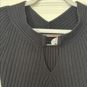 Stylish black ribbed knit sweater with a unique neckline. Perfect for any occasion.