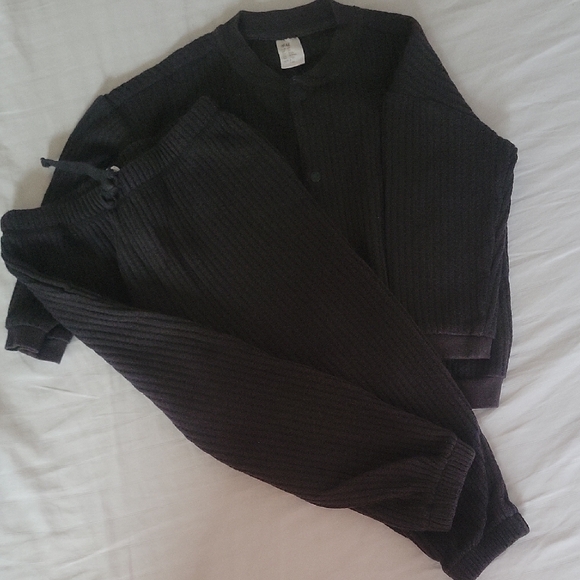 Comfortable black ribbed lounge set. Includes a long-sleeve top and matching pants.