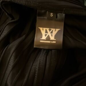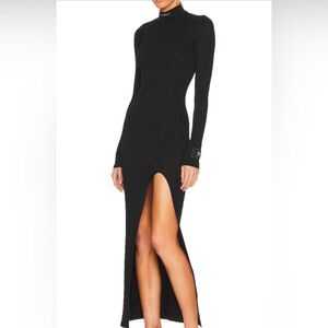 This sophisticated black maxi dress features a ribbed texture and a sleek sheath silhouette. The mock neck and long cuffed sleeves offer a refined touch, while the dramatic side slit adds a bold element, making it perfect for cocktail events or a night out.