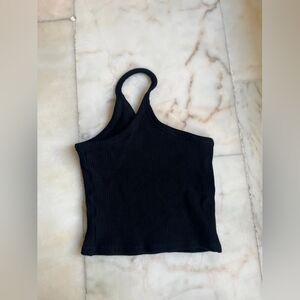 Elevate your style with this chic black ribbed one-shoulder top. Perfect for any occasion, this top offers a sleek and modern look.