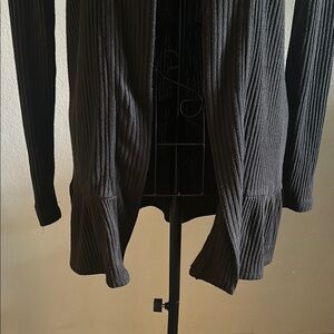 Black Ribbed Open Front Cardigan with Ruffle Bottom.