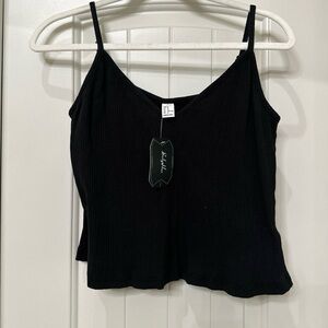 Elevate your wardrobe with this chic black ribbed top. Perfect for any occasion, its spaghetti straps offer a stylish and comfortable fit. Bought from SHEIN size XL fits like a fitted Medium TBH
