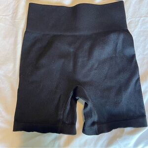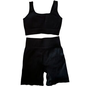Sleek black ribbed sports bra and shorts. Ideal for fitness or lounging.