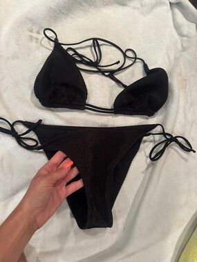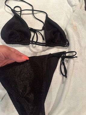 Two-piece black ribbed bikini. Triangle top with adjustable ties. Matching tie-side bottoms with textured ribbed fabric. Sleek and classic swim look. Wore once for a few hours does fit me right. Bought from a boutique store. Great quality