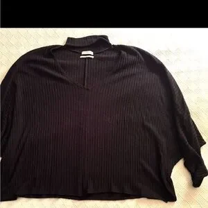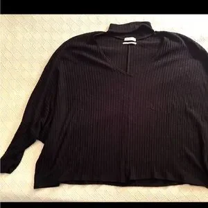Stylish black ribbed sweater with a turtleneck collar and v-neck cutout. Perfect for casual wear.