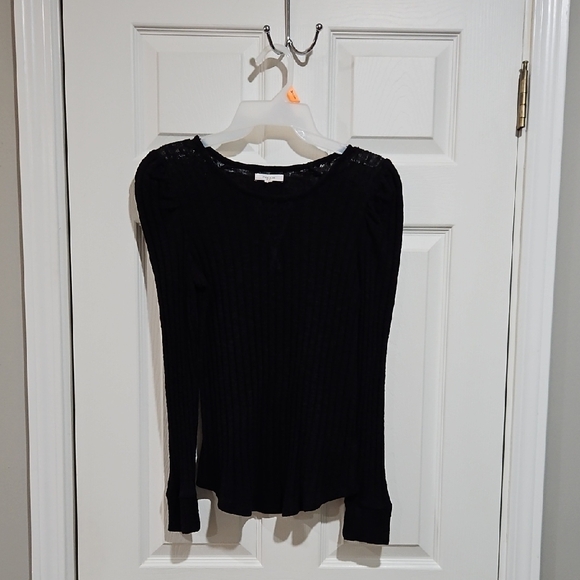 Maurices black ribbed, lightweight sweater. It has cuff sleeves and a lace detail on the shoulders also a v cut out on front. This is super soft and comfy.