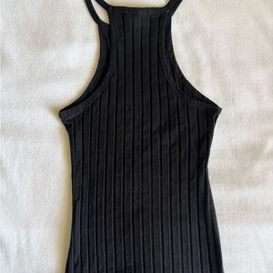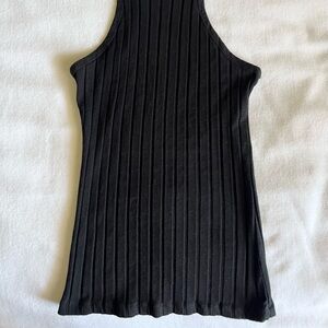 Fitted black ribbed tank top. Perfect for versatile styling. Modern and chic design.