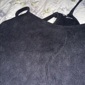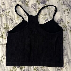 Stylish black ribbed tank top with spaghetti straps. Perfect for casual wear. Rarely worn. It’s a medium and if you’re larger than 34B it will probably be a little tight, but it’s stretchy.