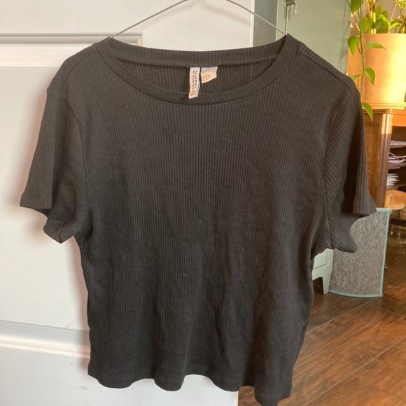 Black ribbed tshirt. Originally from H&M. Slightly cropped, high neckline. Super cute!