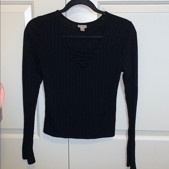 Black ribbed tank top with cross front. Good material, pretty thick. Lightly worn, I think this was from Target but not sure. Fits like a small.