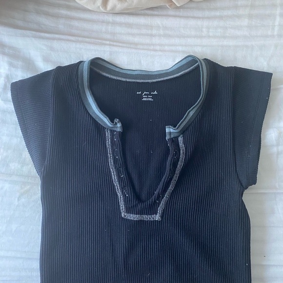 Stylish black ribbed top featuring blue trim. Perfect for casual wear.