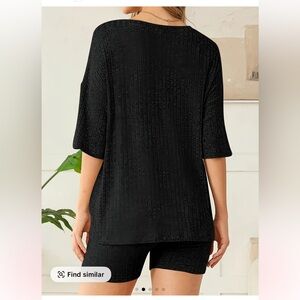 Stylish black ribbed two-piece set. Includes a loose top and fitted shorts. Perfect for casual wear.