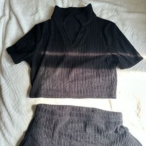 Stylish black ribbed two-piece set. Includes a short-sleeve top and skort.