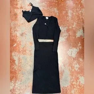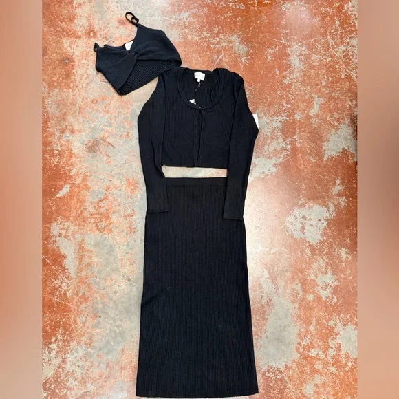Stylish black ribbed three-piece set. Includes a long-sleeve top, under too, and matching skirt.