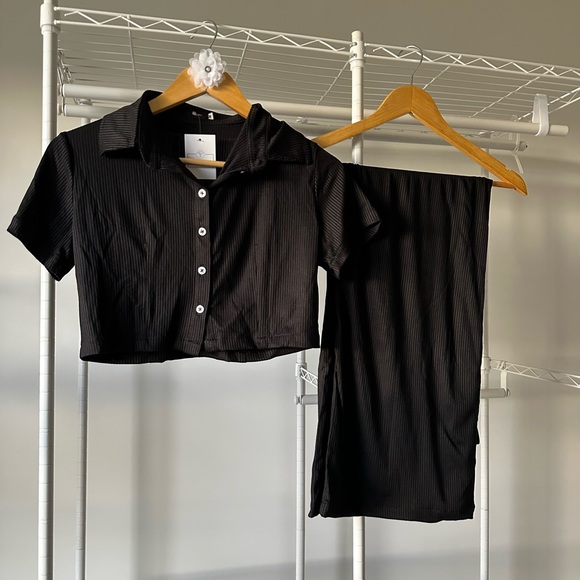 Stylish black ribbed two-piece set featuring a short-sleeve top and matching pants. Perfect for a chic and comfortable look.