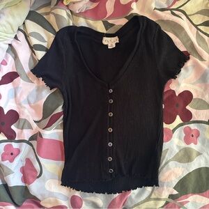Soft black ribbed V-neck tee by . Features short sleeves, front button detailing, and a subtly ruffled hem for a feminine finish. Lightweight and versatile for everyday styling.