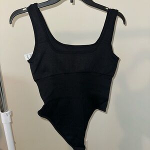 Elegant black ribbed bodysuit. Ideal for versatile styling.