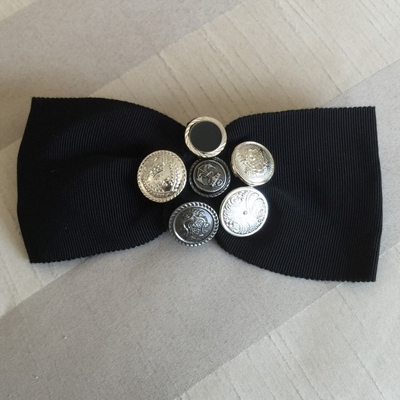 Black ribbon bow pin with button detail in the center. Can be used to decorate a jacket or as a bow for a button up shirt.