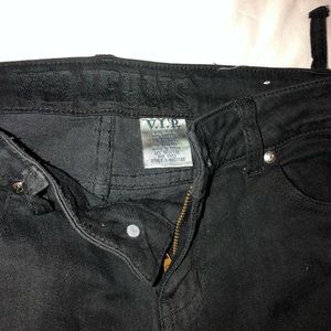 Distressed Skinny leg Black Jeans. The pants height go to just below the ankle. Worn 3 times & one belt loop is ripped. Bought these & they got to small for me.
