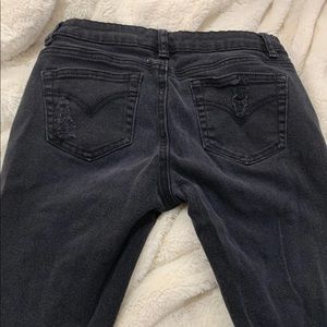 Charlotte Russe Skinny Jeans in a black distressed wash size 3 but fits like a hollister 00-0 jegging! very worn but no flawsother than fading