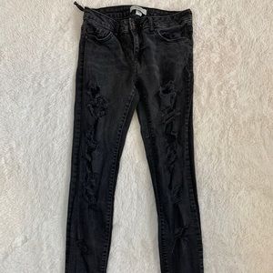Black ripped jeans, good condition with one ripped belt loop on the right hip.