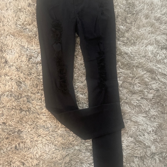 Pet/Smoke feee environment. Black express jeans with stylish pocket tear on left front pocket and from the thighs to the knees on both legs.